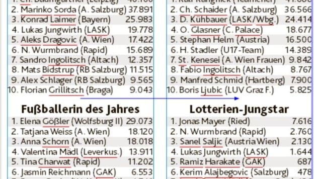 Bei der Fußballerin des Jahres hat Wolfsburg-Legionärin Elena Gößler weiter den Platz an der Sonne inne – so wie auch Jonas Mayer (Ried) beim Lotterien-Jungstar. Aber abgerechnet wird erst am Schluss. Und erfahrungsgemäß kommen erst am Ende die ganz großen Stimmzettel-Pakete, die wichtiger als die Online-Stimmen sind.